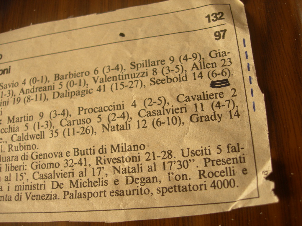 Potevo raccontargli di quella volta che vidi con i miei occhi Aldo Seebold, uno spilungone di Cannaregio, Venezia, con il cognome americano ma il nome da tabaccaio (Aldo, ti me da un pacheto de Camel Blu?), segnare 14 punti, con 2 su 2 nei tiri liberi e 6 su 6 su azione, incluso un ultimo, delirante “gancio cielo”, che ci portò in paradiso.