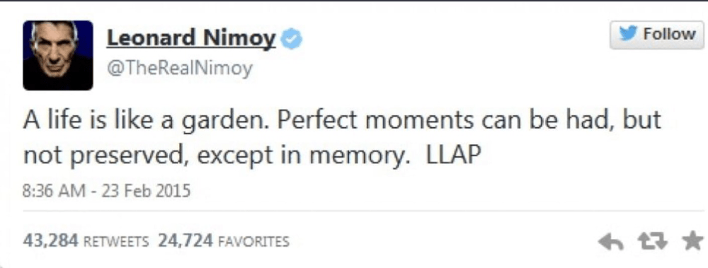 Pochi giorni fa Leonard Nimoy, ovvero il signor Spock, se ne è andato, alla bellezza di 83 anni (a dispetto dello stupore e di tutti i vari RIP che ho letto in giro, direi che non gli è andata così male). Il suo ultimo tweet è una di quelle frasi che farebbero la gioia di Fabio Volo, ammesso che riesca a capirla, dice una cosa tipo: “La vita è come un giardino. Si possono avere dei momenti perfetti, ma non conservarli, se non nella memoria”.
