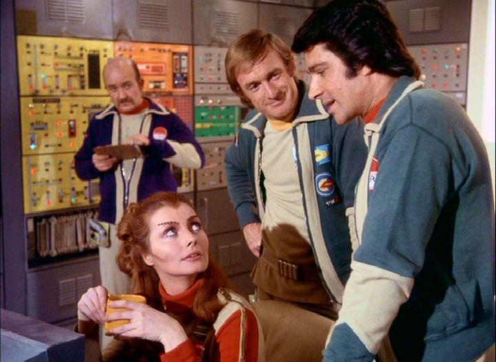 A capo dei sopravvissuti c’è il Comandante John Koenig, interpretato da Martin Landau, all’epoca nemmeno cinquantenne, e una serie di personaggi più o meno di contorno, vestiti, gli uomini, con pantaloni a zampa d’elefante e magliette acriliche tendenti al beige, da irritazione cutanea istantanea, e le donne (alcune) in minigonne e stivali, direttamente da Carnaby Street.