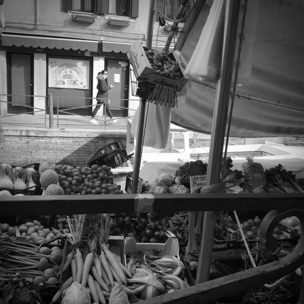 Lo “scontro” fra i poliziotti e il nativo finisce con un nulla di fatto. L’agente più agitato si rivolge allora al fruttivendolo poco più lontano (il primo che si incontra entrando in Via Garibaldi), chiede al proprietario perché non stia indossando la mascherina. Il tipo non si scompone nemmeno, ha la faccia di uno che con la polizia ha avuto a che fare altre volte nel passato, dice che non si trovano, mentre a mani nude pesca gli ultimi tre cułi di carciofo dal recipiente pieno d’acqua dove galleggiano annoiati, e li mette in un sacchetto di plastica, infilandoci pure del prezzemolo (i cułi di carciofo, la “ł” in veneziano non si pronuncia, sono i fondi di un tipo di carciofo molto grande, che vengono tagliati dal resto del fiore per essere cotti in padella, semplicemente con olio, aglio e prezzemolo, n.d.r.). L’agente sembra già aver perso la verve iniziale e lo saluta, allontanandosi con gli altri due colleghi; nel frattempo io entro in farmacia, stranamente vuota.