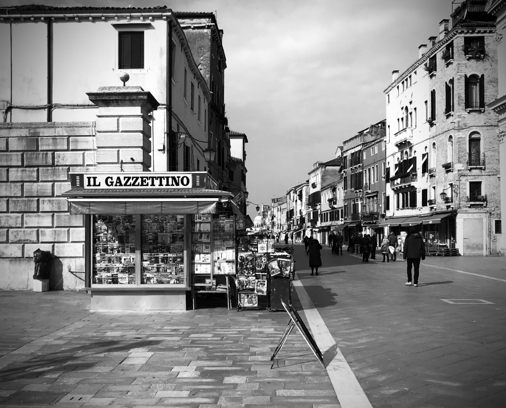 Poco prima di arrivare alla Coop c’è un’edicola, una delle ultime 4/5 della città che si ostinano a vendere realmente giornali. Sul tetto ha un’insegna a lettere cubitali con il nome del più vecchio giornale della città. “Il Gazzettino” e qui non si possono trovare le patacche per turisti che invece abbondano in tutte le altre, in maggioranza gestite da cittadini del Bangladesh. L’edicolante è un ragazzo giovane, che però sta già pasticciando con i capelli, acconciati con una specie di riporto che ricorda la sequenza di Fibonacci. Ascolta di continuo la musica con il suo Mac portatile, e appena può va a sedersi sugli scalini dell’edifico che gli sta di fronte, a favore di sole, dove si lascia scaldare dai tiepidi raggi di questo inizio primavera.