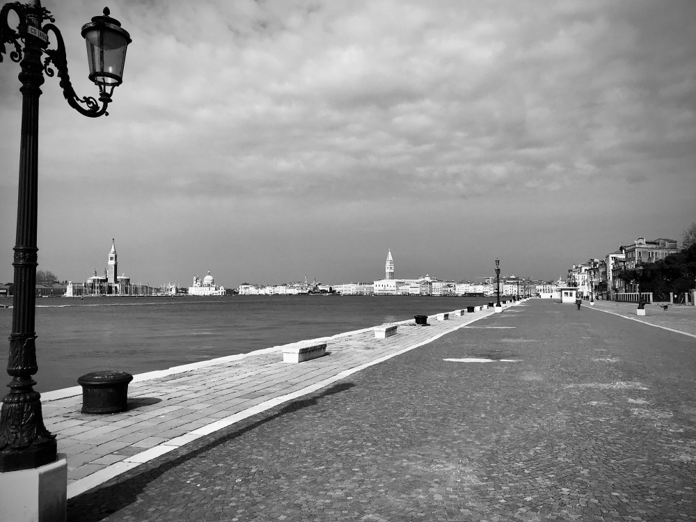 I tre poliziotti camminano uno a fianco all’altro, in riga, forse per darsi forza, ma via Garibaldi a Castello, Venezia, è larga abbastanza per farli sentire soli. Portano tutti la mascherina azzurra a protezione del naso e della bocca, quello al centro ha una cartellina blu chiaro in mano, tutti indossano dei guanti monouso, sempre azzurri. Non so di chi sia stata l’idea, ma trovo l’abbinamento dei colori molto elegante.